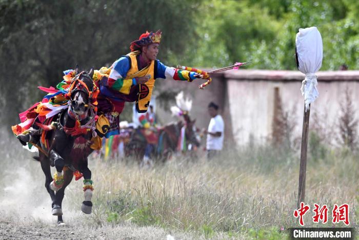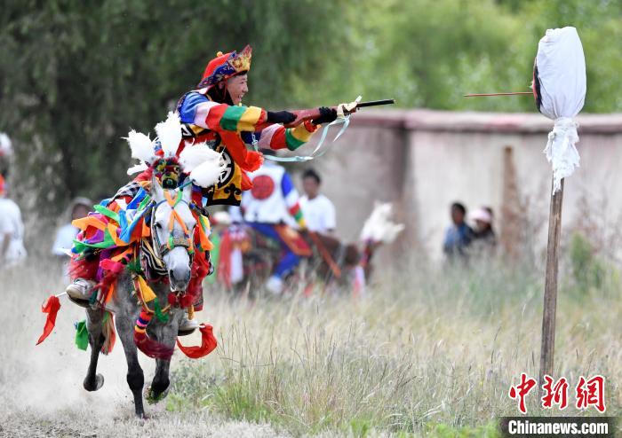 7月27日,西藏拉薩市桑達村迎來“望果節”,村民們(men) 舉(ju) 行賽馬活動慶祝。“望果節”是西藏傳(chuan) 統的豐(feng) 收節,具體(ti) 日期隨各地莊稼成熟的時間而變化。“望果節”期間,按照習(xi) 俗,各地都會(hui) 舉(ju) 辦賽馬比賽。圖為(wei) 騎手進行馬上射擊表演。中新社記者 李林 攝