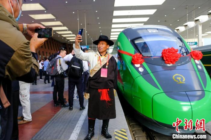 資料圖為(wei) 2021年6月25日,西藏拉林鐵路開通運營,拉薩曲水縣三有村村民次旦平措在複興(xing) 號前拍照留念。記者 江飛波 攝