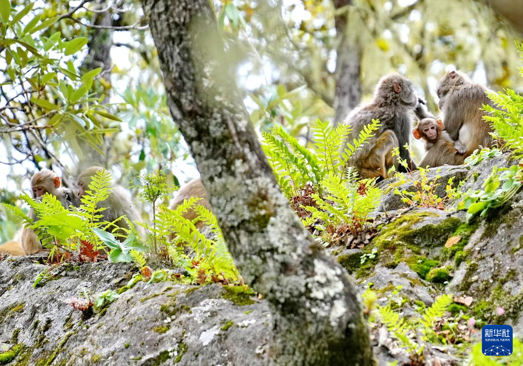 巴鬆措旅遊風景區裏嬉戲的藏獼猴(8月2日攝)。新華社記者 張汝鋒 攝