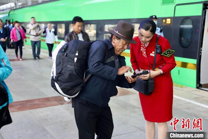 圖為(wei) 拉日鐵路列車乘務員服務藏族旅客。資料圖 馬生明 攝