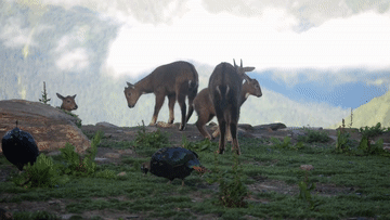 清晨,喜馬拉雅斑羚、棕尾虹雉、珠頸斑鳩等各類動物出現在山間的一處平台上,吸引周邊的遊人欣賞這自然之美。