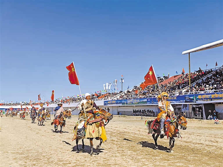 圖為(wei) 那曲恰青賽馬節暨第三屆“鄉(xiang) 村振興(xing) 那曲奮進”活動開幕式上,馬術表演隊隆重出場。