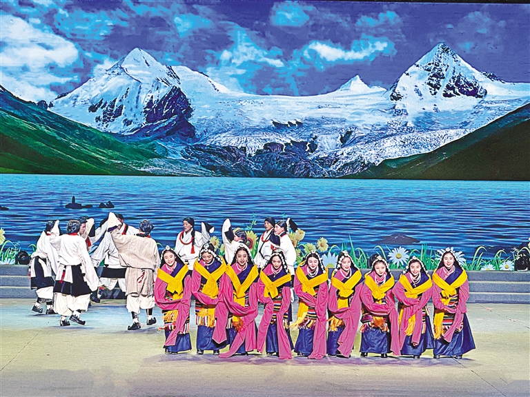 圖為(wei) 班戈縣群眾(zhong) 在那曲市11縣區文藝調演比賽中表演舞蹈。