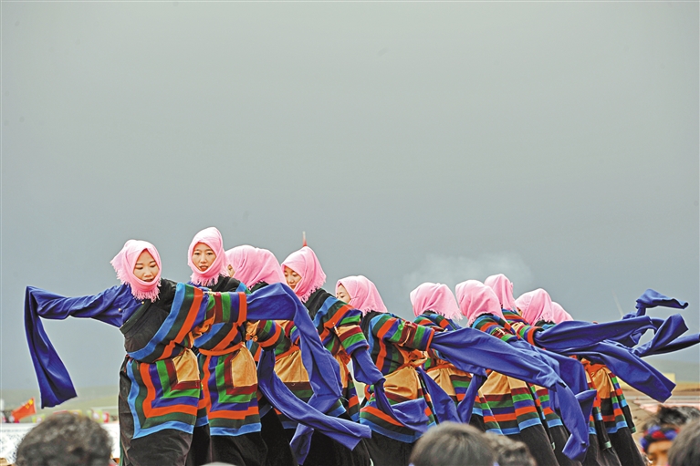 圖為(wei) 安多縣群眾(zhong) 在那曲市11縣區文藝調演比賽中表演。