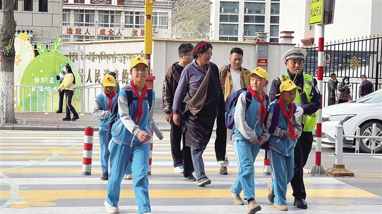 此外,拉薩交警還利用每日“護學崗”時間,主動引導學生正確過馬路、認識交通信號燈,提醒學生不在馬路上嬉戲、追逐打鬧,不乘坐三輪摩托車等不規範車輛,並向接送學生的家長講解接送孩子途中應注意的安全事項,告誡學生家長以身作則,杜絕橫穿馬路、闖紅燈等交通陋習(xi) ,共同營造安全、暢通、文明和諧的道路交通環境。“我們(men) 鼓勵孩子們(men) 將學到的交通安全知識帶回家,充分發揮‘小手拉大手’作用,向家人宣傳(chuan) 道路交通安全知識,強化家長、學生安全意識和自我保護意識。”馬定雄說。
