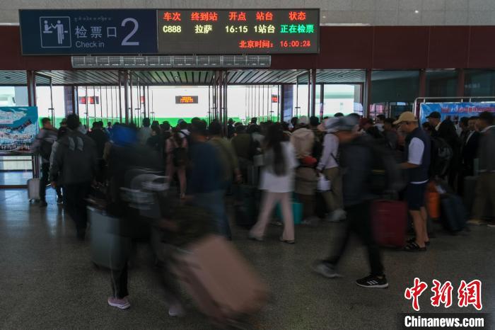 8月16日,西藏拉日鐵路通車十周年。作為(wei) 連接拉薩與(yu) 日喀則間的高原城際鐵路,十年來,拉日鐵路運送旅客超1429萬(wan) 人次,運送貨物超524萬(wan) 噸。圖為(wei) 16日,西藏拉日鐵路日喀則站內(nei) ,旅客檢票乘車前往拉薩。中新社記者 江飛波 攝
