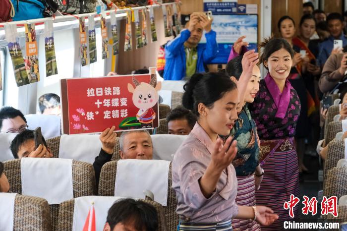 8月16日,西藏拉日鐵路通車十周年。作為(wei) 連接拉薩與(yu) 日喀則間的高原城際鐵路,十年來,拉日鐵路運送旅客超1429萬(wan) 人次,運送貨物超524萬(wan) 噸。圖為(wei) 16日,中國鐵路青藏集團有限公司職工在C885次動車組列車上表演鍋莊舞,與(yu) 乘客共同慶祝拉日鐵路通車十周年。中新社記者 江飛波 攝