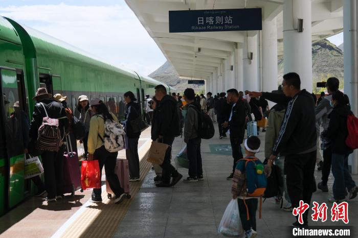 8月16日,西藏拉日鐵路通車十周年。作為(wei) 連接拉薩與(yu) 日喀則間的高原城際鐵路,十年來,拉日鐵路運送旅客超1429萬(wan) 人次,運送貨物超524萬(wan) 噸。圖為(wei) 16日下午,乘客在拉日鐵路日喀則站搭乘C888次高原複興(xing) 號動車組前往拉薩。中新社記者 江飛波 攝