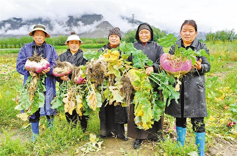 圖為(wei) 8月14日,在田間抱著蕪菁新品種的拉薩市曲水縣才納鄉(xiang) 才納村村民。新華社發(盧丹陽 攝)