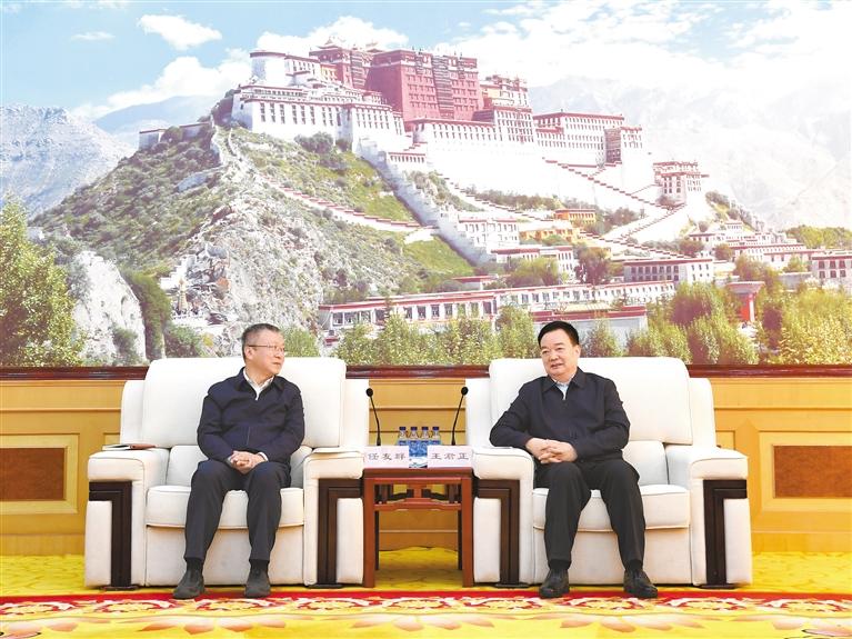 18日,西藏自治區黨(dang) 委書(shu) 記王君正在拉薩與(yu) 山東(dong) 大學黨(dang) 委書(shu) 記任友群,校長、中國工程院院士李術才率隊的赴藏考察團座談。