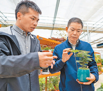 胡發煒(右)在紅河穀農(nong) 業(ye) 園區查看盆栽生長情況。記者 徐馭堯攝