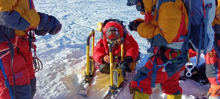 科考隊員用雷達測厚儀(yi) ,在海拔8201米的卓奧友峰峰頂測量冰雪厚度(2023年10月1日攝)。 新華社發