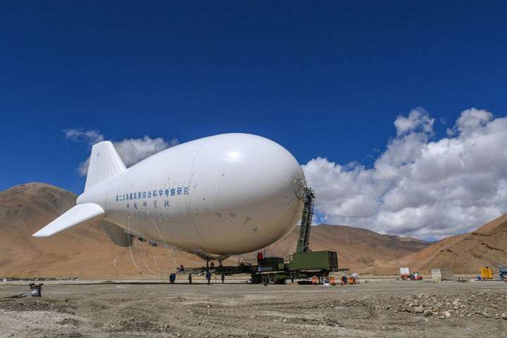 完成充氣後的“極目一號”Ⅲ型浮空艇在中科院珠峰站附近等待升空(2022年5月12日攝)。新華社記者 薑帆 攝