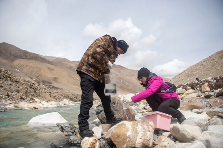 在東(dong) 絨布冰川區域,科研人員在進行微生物指標水樣采集(2022年4月30日攝)。 新華社記者 旦增尼瑪曲珠 攝