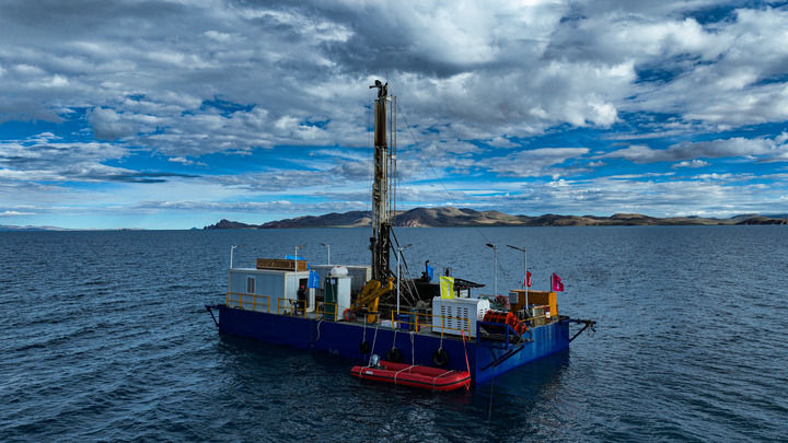 2024年7月11日拍攝的納木錯水上鑽探平台(無人機照片)。 新華社記者 晉美多吉 攝