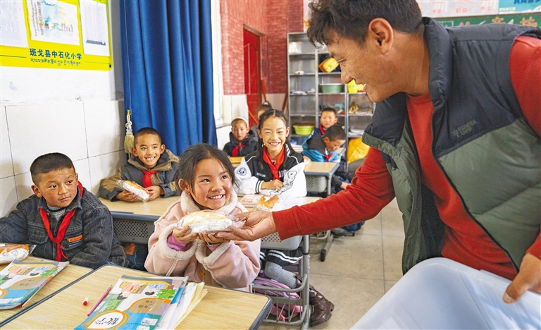 西藏那曲市班戈縣中石化小學是目前全國海拔最高的援藏小學,由中石化集團結對幫扶建立,2012年投入使用。圖為(wei) 班戈縣中石化小學後勤副校長尼旦為(wei) 學生們(men) 分發營養(yang) 餐(資料圖片)。新華社記者 丁增尼達 攝