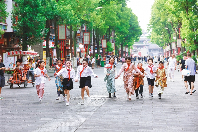圖為(wei) 藏渝兩(liang) 地學生手牽手奔跑在山城街頭。通訊員 擁金卓嘎 攝