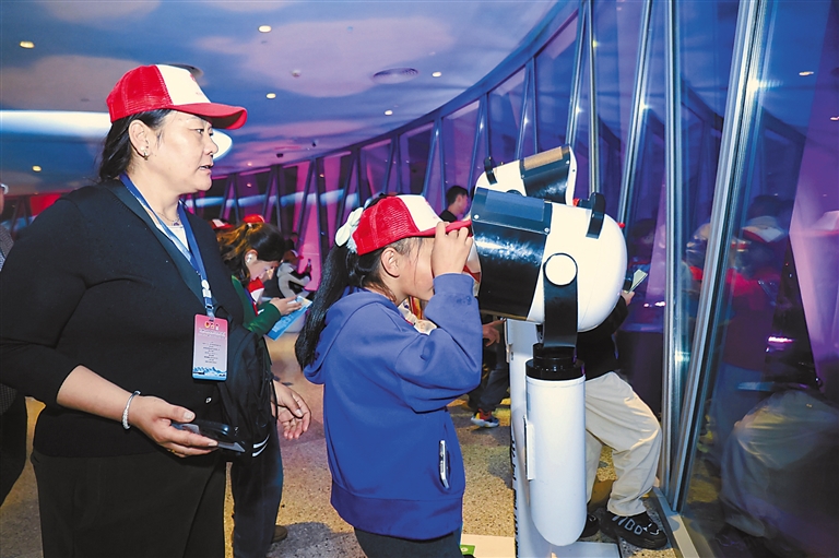 圖為(wei) 參加冬令營研學交流活動的波密少先隊員在廣州塔用共享望遠鏡眺望廣州城市夜景。記者 謝筱純 攝