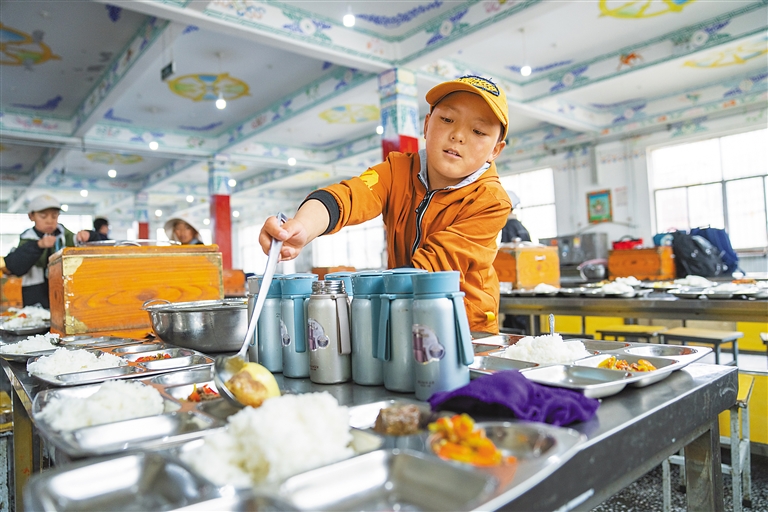 圖為(wei) 那曲市班戈縣中石化小學學生在為(wei) 同學們(men) 分發午餐(6月22日攝)。新華社記者 丁增尼達 攝
