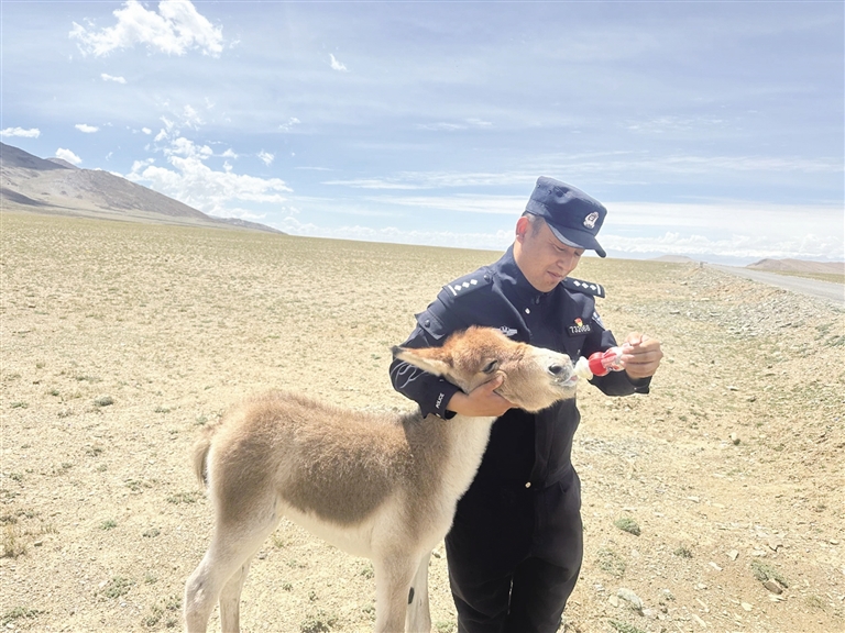 記者從(cong) 阿裏地區公安處了解到,日前,劄達縣公安局吾藏檢查站民警巡邏時發現一隻小野驢倒在馬路邊,民警將小野驢帶到檢查站並前往香孜鄉(xiang) 購買(mai) 奶瓶、純牛奶等物資救助小野驢。