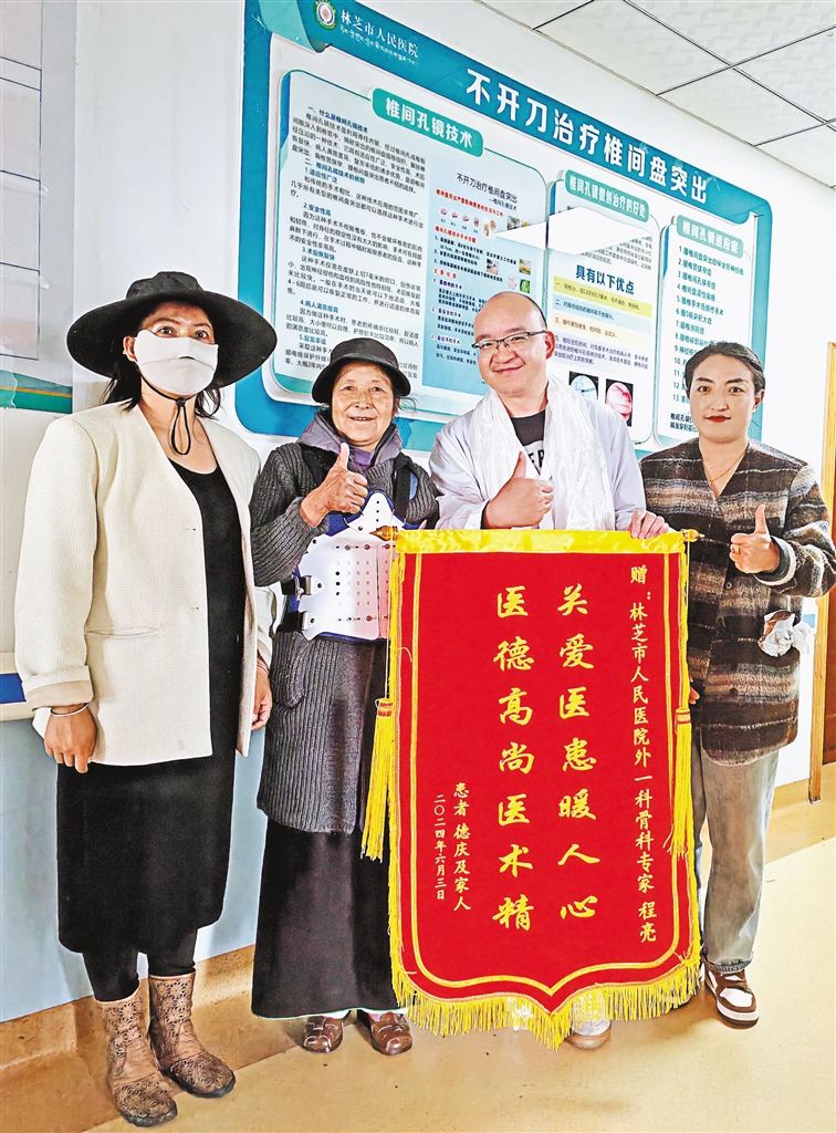 圖為(wei) 患者康複後為(wei) 援藏醫生贈送錦旗表達感謝。(圖片由林芝市人民醫院提供)