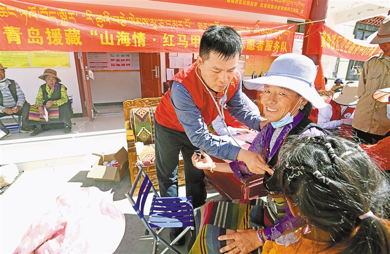 圖為(wei) 青島援藏組“山海情·紅馬甲”醫療誌願者服務隊為(wei) 日喀則市桑珠孜區群眾(zhong) 義(yi) 診。記者 李洲 攝