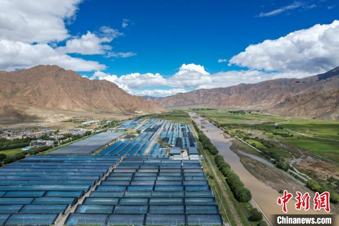 經過近三十年的發展,西藏白朗縣大棚蔬菜產(chan) 業(ye) 已具規模。圖為(wei) 航拍白朗縣年楚河畔的大棚設施。記者 江飛波 攝