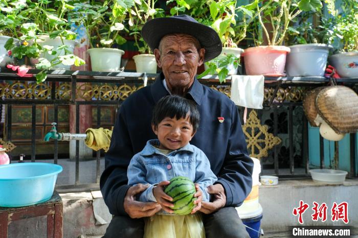 現年77歲的邊巴頓珠是彭倉(cang) 村種大棚“第一人”。圖為(wei) 8月23日,邊巴頓珠和孫女抱著一個(ge) 自家種出來的大棚西瓜。記者 江飛波 攝