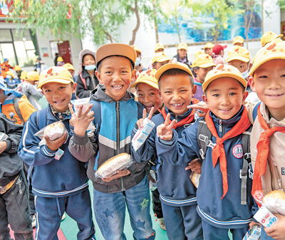 在西藏那曲市班戈縣中石化小學,學生手拿營養(yang) 餐等待放學。新華社記者 丁增尼達攝