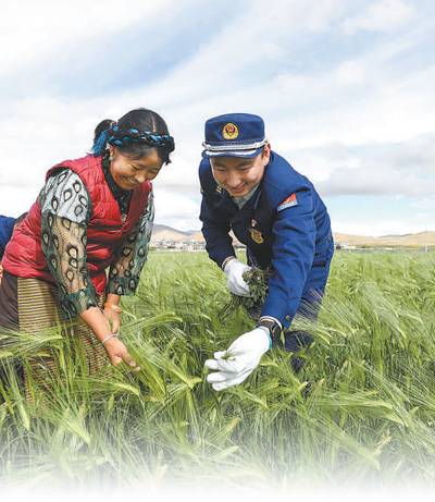 西藏日喀則市崗巴縣援藏幹部幫助村民清除青稞田間的雜草。趙啟瑞攝(人民視覺)
