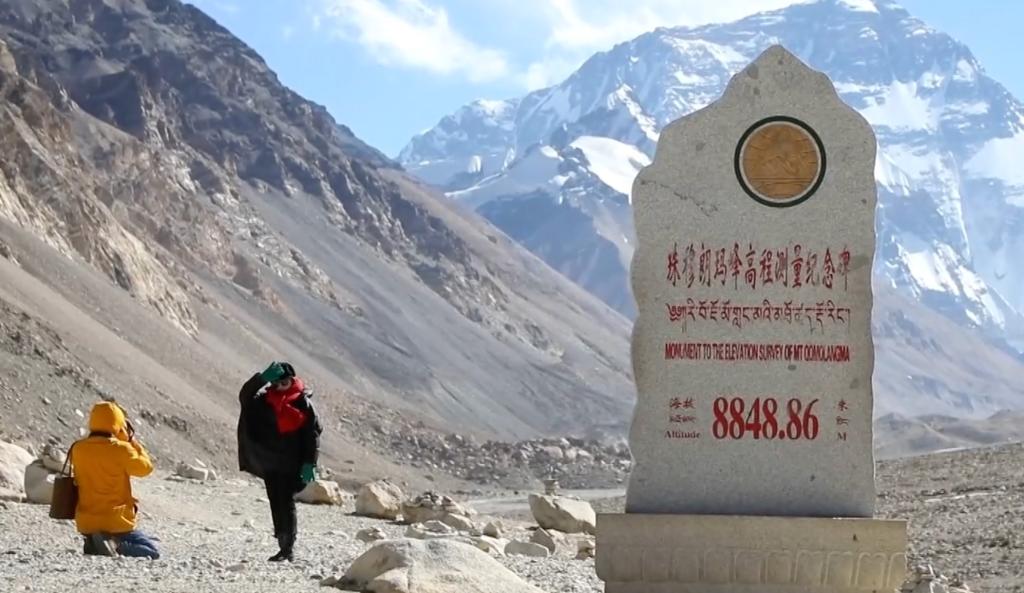 遊客在珠穆朗瑪峰高程測量紀念碑前拍照留念。(受訪者供圖)