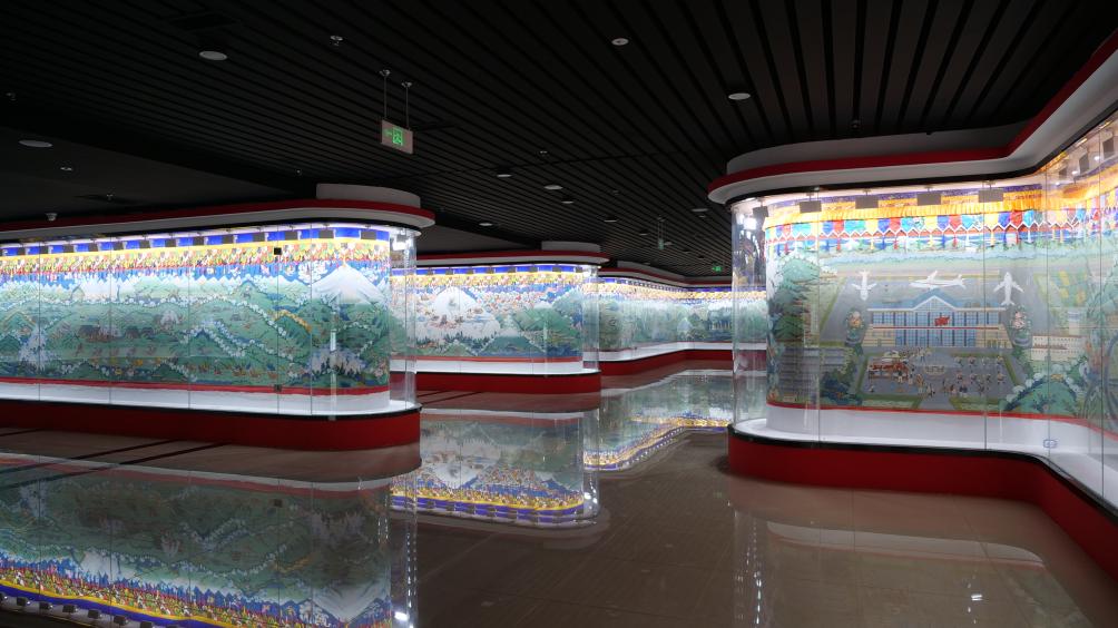 日喀則非物質文化遺產(chan) 展示中心裏展覽的新題材唐卡(2024年5月7日攝)。新華社記者 邱星翔 攝