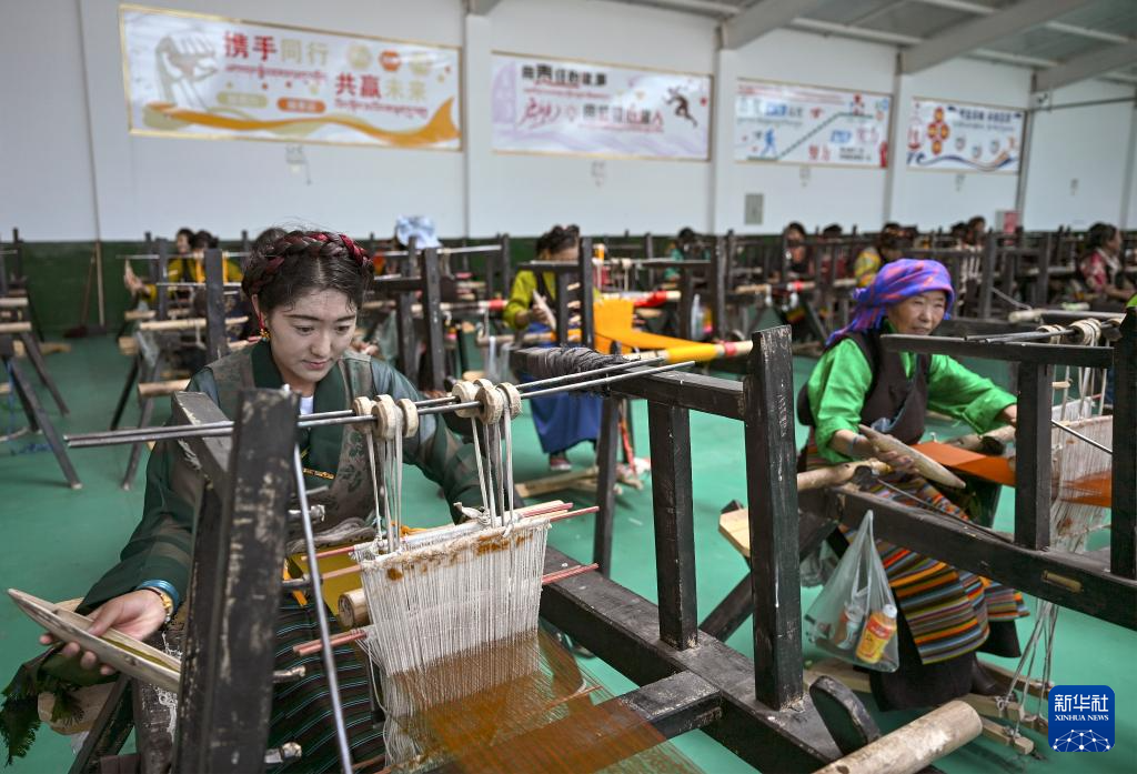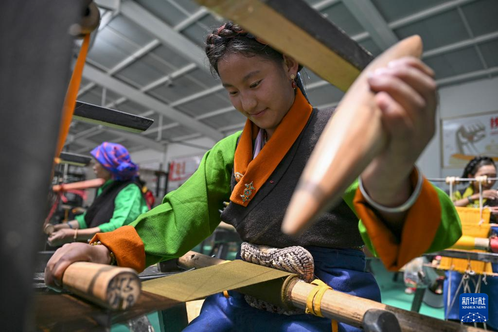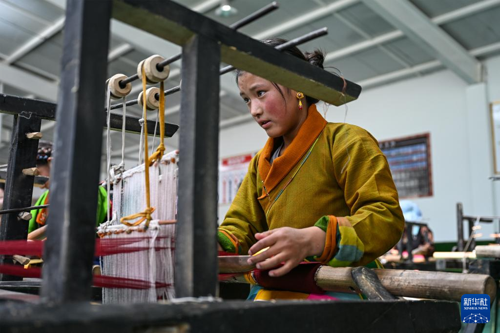 9月1日,在西藏日喀則市仁布縣特色產(chan) 業(ye) 孵化園,亞(ya) 德細褐羊毛織品農(nong) 民專(zhuan) 業(ye) 合作社工作人員在車間裏織布。新華社記者 孫瑞博 攝