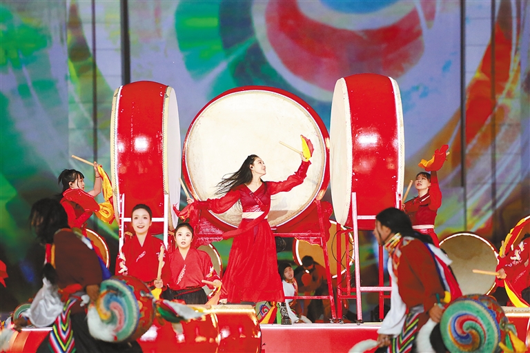 共振共鳴中國鼓,交流交融民族情。在激昂的鼓聲和大開大合的舞姿中,開幕式序曲《大江之鼓》緩緩呈現在所有人麵前。喆友打擊樂(le) 團、山南市瓊結久河卓舞隊等隊伍的近70名鼓手同台獻藝、默契配合,讓鼓聲共振、情感共鳴,展現了激情洋溢、魅力無限的中華鼓文化。