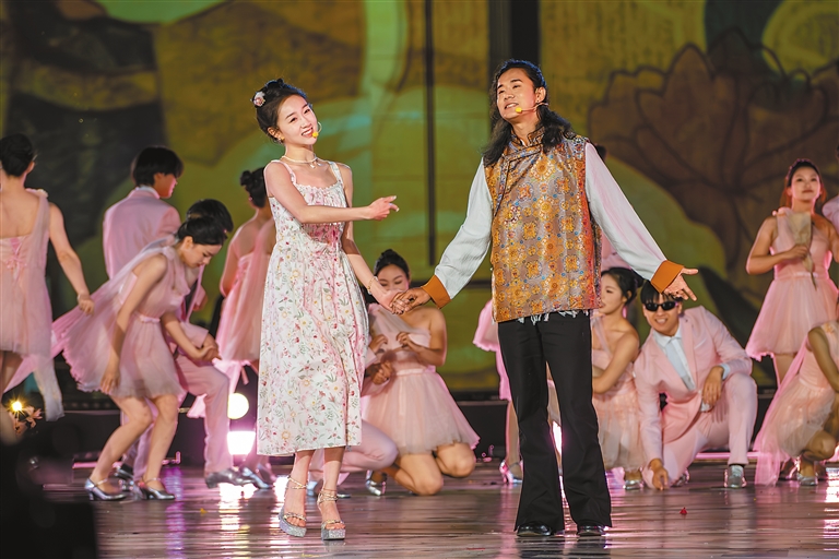 湖南民謠樂(le) 隊與(yu) 山南搖滾樂(le) 隊帶來全新創作歌曲《雅礱歡歌》。這首歌以湖南童謠《月亮粑粑》和山南童謠為(wei) 創作基底,兩(liang) 支青春樂(le) 隊與(yu) 山南職高的15名吉他手共同奏響青春樂(le) 章,“融”出別樣精彩。開幕式晚會(hui) 將《次仁拉索》和《今天你要嫁給我》進行了巧妙的“嫁接”,講述了各民族在交往交流交融中湧現出的愛情故事。