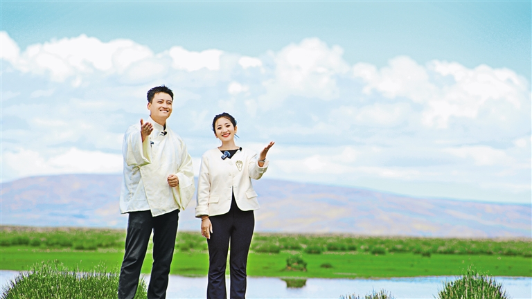 圖為(wei) 色尼區文化和旅遊局副局長塔巴曲珍(右)與(yu) 歌手羅布桑珠錄製宣傳(chuan) 視頻。記者 萬(wan) 靖 攝
