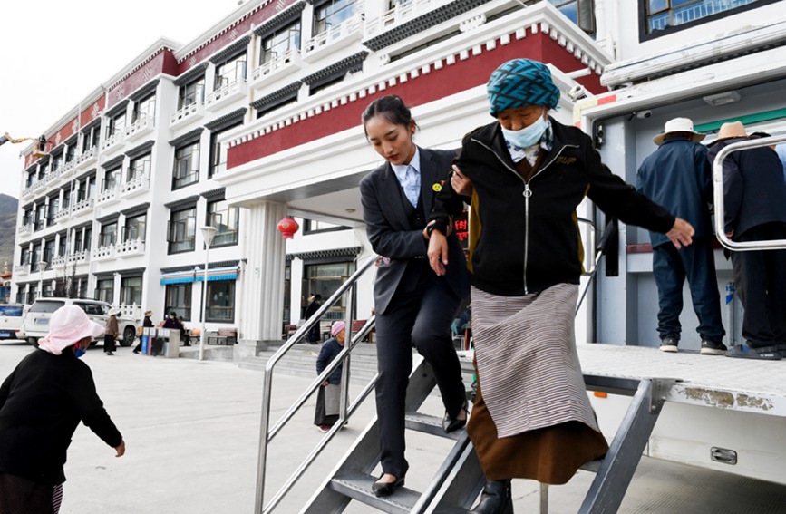 圖為(wei) 農(nong) 行山南乃東(dong) 支行客戶經理娜姆措(左一)攙扶老人走下流動金融服務車。旦增蘭(lan) 澤攝