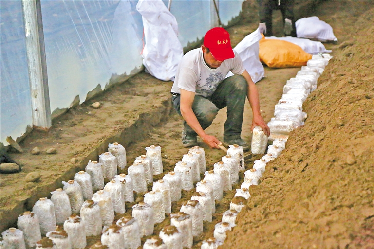 米林市米林鎮紅太陽家庭示範農(nong) 場的工人在埋植林芝靈芝的三級菌包。記者 謝筱純 攝