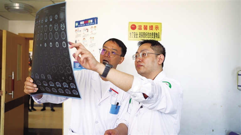 昌都市人民醫院外二科主任餘(yu) 正強(左)與(yu) 重慶市第十批援藏幹部、昌都市人民醫院神經外科副主任熊偉(wei) 茗(右)正在討論患者治療方案。