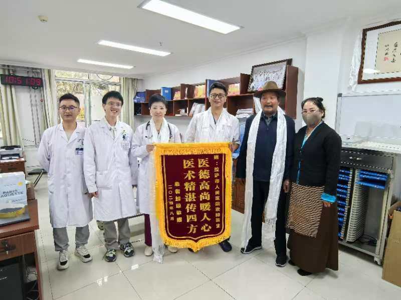 “突切囊,突切囊(非常感謝)。”患者加瓊即將離院之際,特意向主治醫生索朗和郭麗(li) 珠獻上哈達和錦旗。