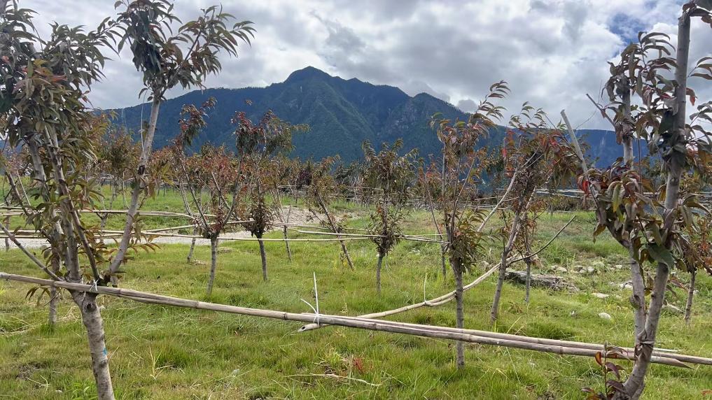 9月6日,在西藏林芝市巴宜區林芝鎮嘎拉村村外的同一片河灘上,植被覆蓋黃沙,桃樹枝葉漸長。(尼瑪曲吉 攝)