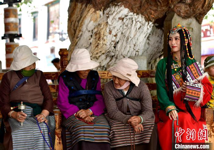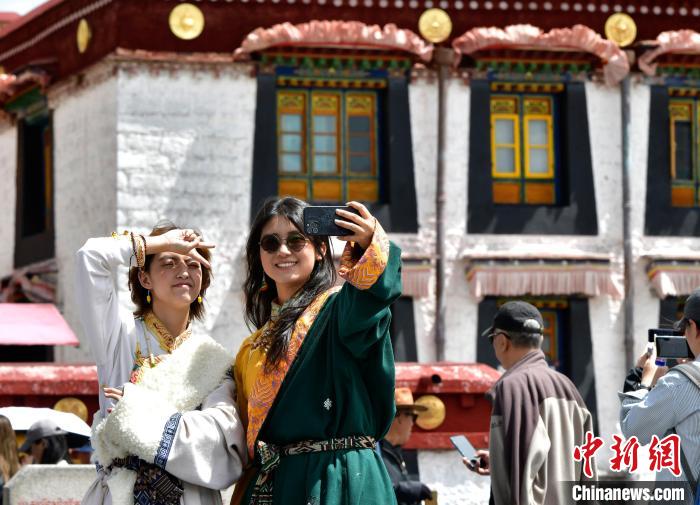 近年來,隨著文化旅遊的興(xing) 起,西藏正快速推進文旅融合。八廓街、布達拉宮廣場等地,身著藏服拍攝寫(xie) 真也成為(wei) 眾(zhong) 多遊客進藏旅遊標配。圖為(wei) 9月7日遊客在八廓街拍攝藏服寫(xie) 真。中新社記者 李林 攝