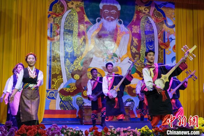 9月7日晚,西藏山南紮西曲登社區居民索朗堅才(右前)在舞台上表演彈奏六弦琴。中新社記者 江飛波 攝