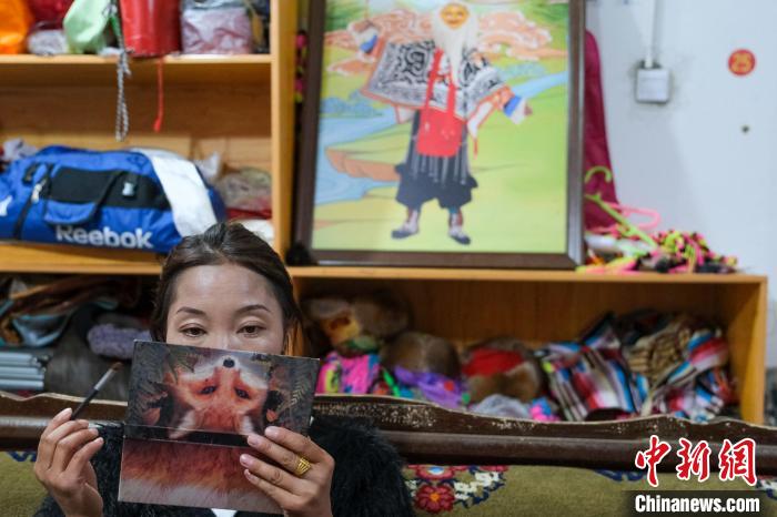 9月7日晚,西藏山南紮西曲登社區農(nong) 牧民白瑪央宗化妝準備登台表演傳(chuan) 統藏戲,山南鍋莊等。其身後是一幅藏戲畫。中新社記者 江飛波 攝