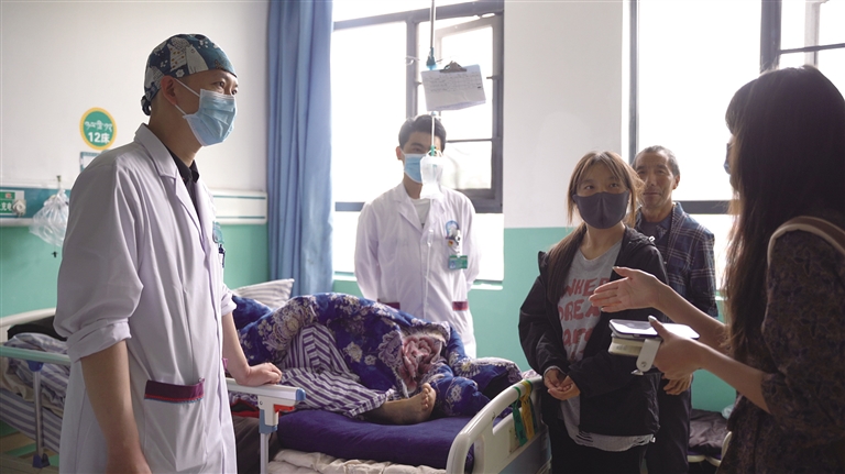 天津市第十批援藏幹部、昌都市藏醫院外科行政副主任陳陽(左一)正在查房。