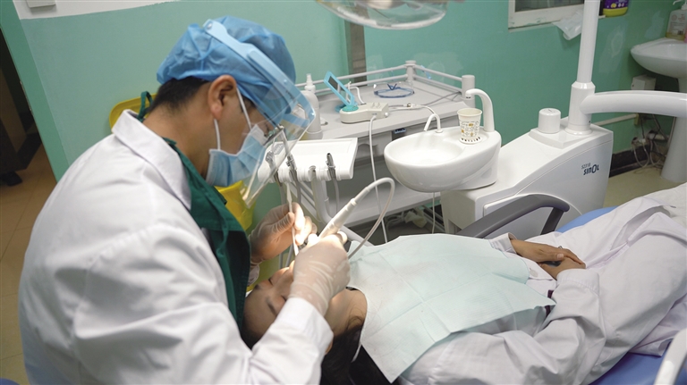 天津市第十批援藏幹部、昌都市藏醫院口腔科副主任醫師杜斌正在對患者開展口腔治療。