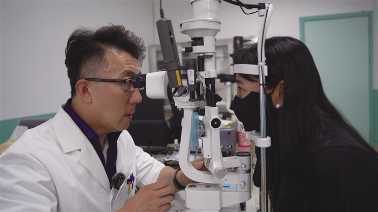 天津市第十批援藏幹部、昌都市藏醫院眼科副主任醫師步紹翀開展眼科檢查。