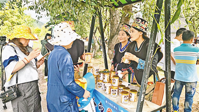 圖為(wei) 林卡主題音樂(le) 會(hui) 上,工作人員為(wei) 市民、遊客介紹農(nong) 特產(chan) 品。