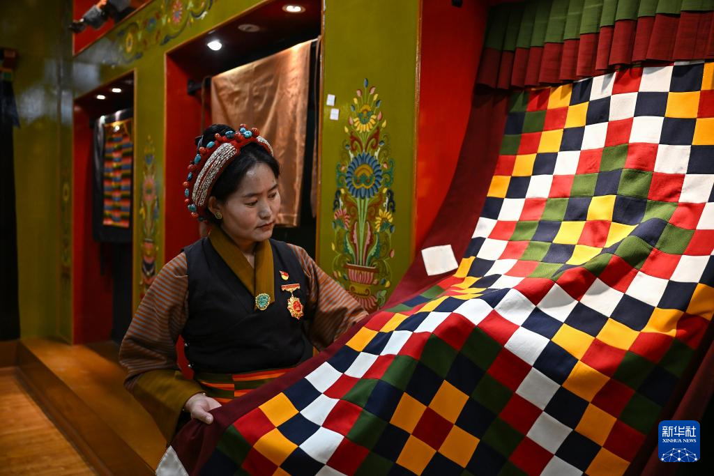 西藏日喀則市仁布縣特色產(chan) 業(ye) 孵化園,亞(ya) 德細褐紡織手工藝傳(chuan) 承人南木珍在展示作品