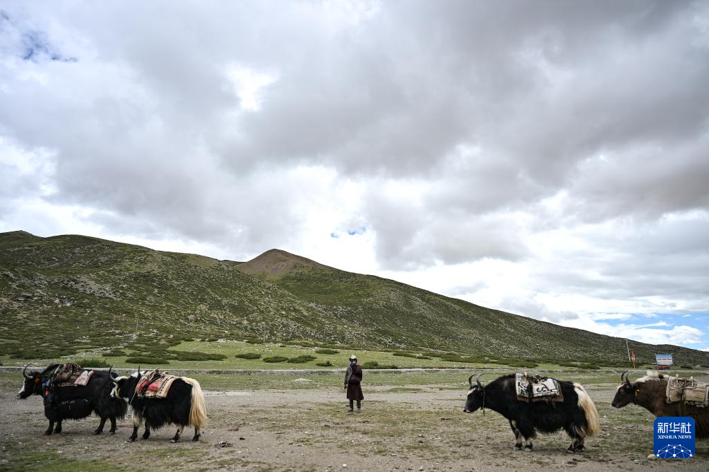 9月8日,在普蘭(lan) 縣巴嘎鄉(xiang) 崗莎村,牧民正在驅趕犛牛運送轉山遊客的貨物。新華社記者孫瑞博 攝